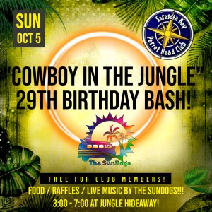 We are proud to announce that on Sunday, October 5th, we will host our 29th annual birthday bash at the Jungle Hideaway! There will be food, games, and live music by the Sundogs! Cash bar and FREE for club members from 3:00 until 7:00! Plus drink specials, door Prize raffle, and raffles!